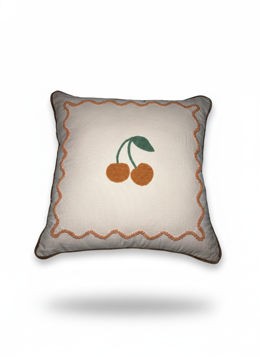 Playful cherry-themed cushion with rich embroidery.