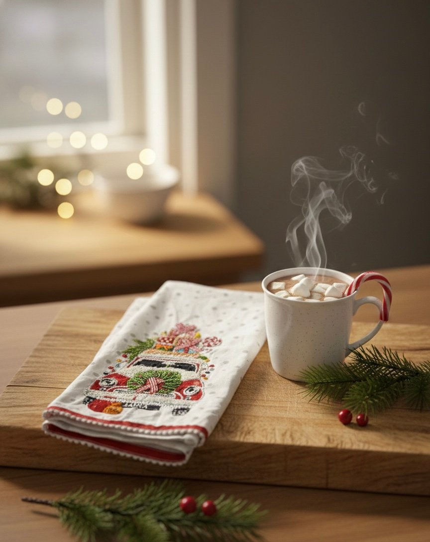 Bring home the magic of old-fashioned Christmas with this Vintage Christmas Truck Kitchen Towel. Crafted in textured slub fabric, it carries a warm, rustic feel that reminds you of snowy evenings and festive traditions. Perfect for holiday baking days, gifting, or simply adding joyful character to your kitchen.